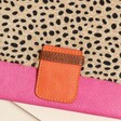 It’s secured with a vibrant orange strap and popper closure, adding both security and a pop of colour. Inside, you’ll find four tabs for organisation, along with a gold metal zipped pocket to keep your valuables safe. Made from pink vegan leather and lined with soft pink cotton, it provides a luxurious finish.