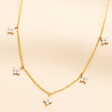 Made of 14ct gold plated brass, this pretty necklace consists of a delicate trace chain suspending five dangling flower-shaped charms infilled with pale lilac crystals. Dainty and lightweight enough for everyday wear, this necklace would also be perfect as part of a jewellery stack, and can easily be adjusted via the lobster clasp and extender chain.