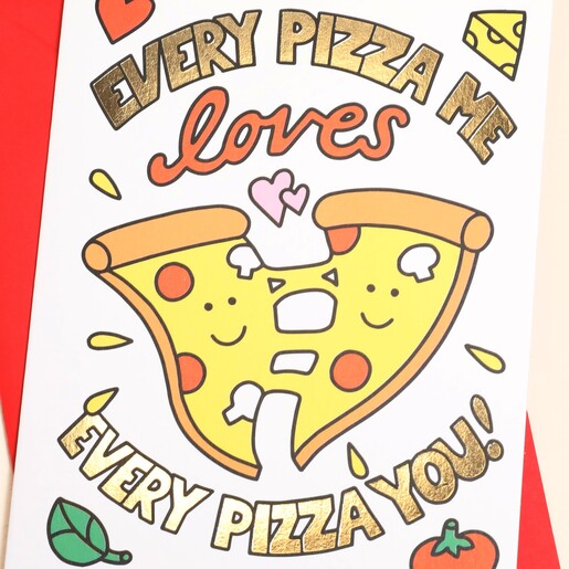 Printed in the UK, this card from Ohh Deer features a cheesy illustration of two pizzas. The text reads 'Every pizza me loves every pizza you' in a gorgeous gold font. Left blank inside so you can write your own heartfelt message, this card comes with a corresponding red envelope for easy sending.