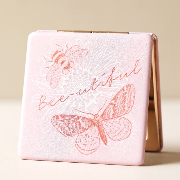 Open the compact and discover one normal mirror and one magnified mirror, tucked inside each half of the accessory which stays together with a hinge. The soft printed surfaces of the compact are designed by the Lisa Angel creative team in-house and feature a flower, bumblebee, and butterfly, with 'bee-utiful' overtop.