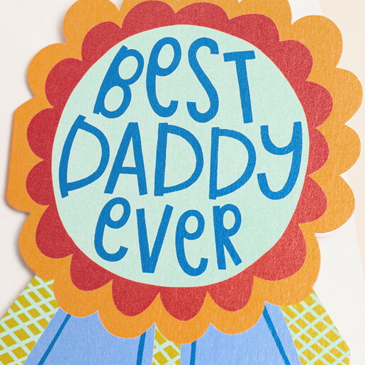This card has a orange and green base and is designed in the playful shape of a rosette. The text on the card reads 'Best Daddy Ever'. This card is blank inside, so you can add your own thoughtful note. With a plain envelope for easy sending, it’s a lovely pick.