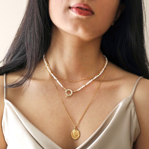 This statement necklace features a large polished gold spring ring clasp, seed pearl beads, and tiny gold-plated beads. The clasp looks sleek and stylish when worn at the front. The delicate pearl beads with hints of gold would look beautiful worn alone or paired with other gold necklaces for a layered look.