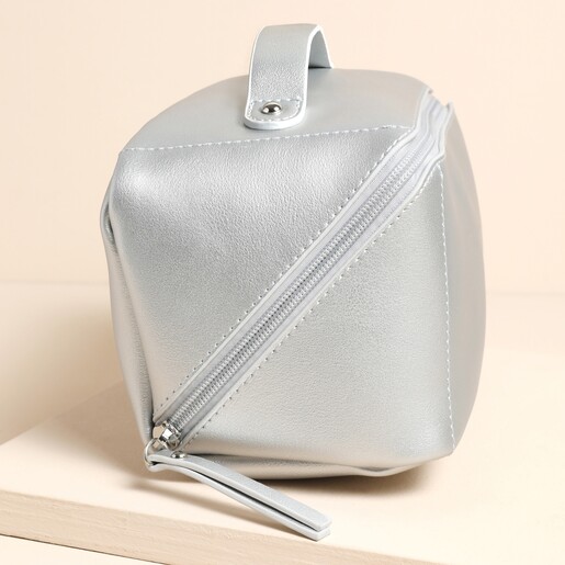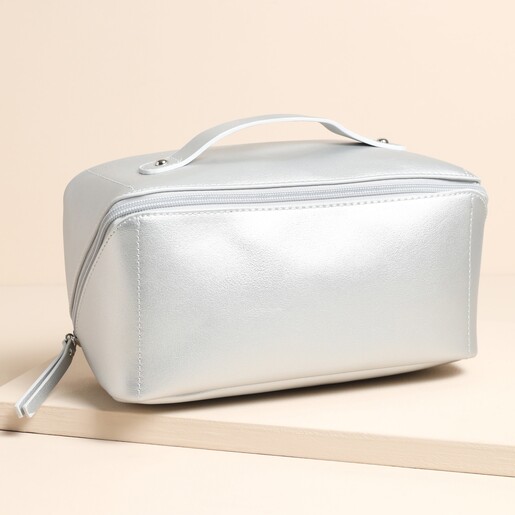 Made in a bright silver finish, this case features a diagonal zip that runs up the sides and across the top, opening to reveal two spacious compartments. Inside, each side includes two pouch pockets on the inner walls, with a central zip-up section dividing the space. A matching handle is attached to the top for easy carrying, making this bag both functional and eye-catching.