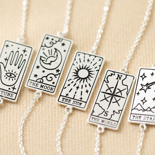 This silver bracelet features a small rectangular charm with a tarot card style design, showing a starry mountaintop scene and 'the star' wording below. Inspired by the cards from traditional tarot decks, this bracelet is a must-have gift for a friend who loves all things mystical.